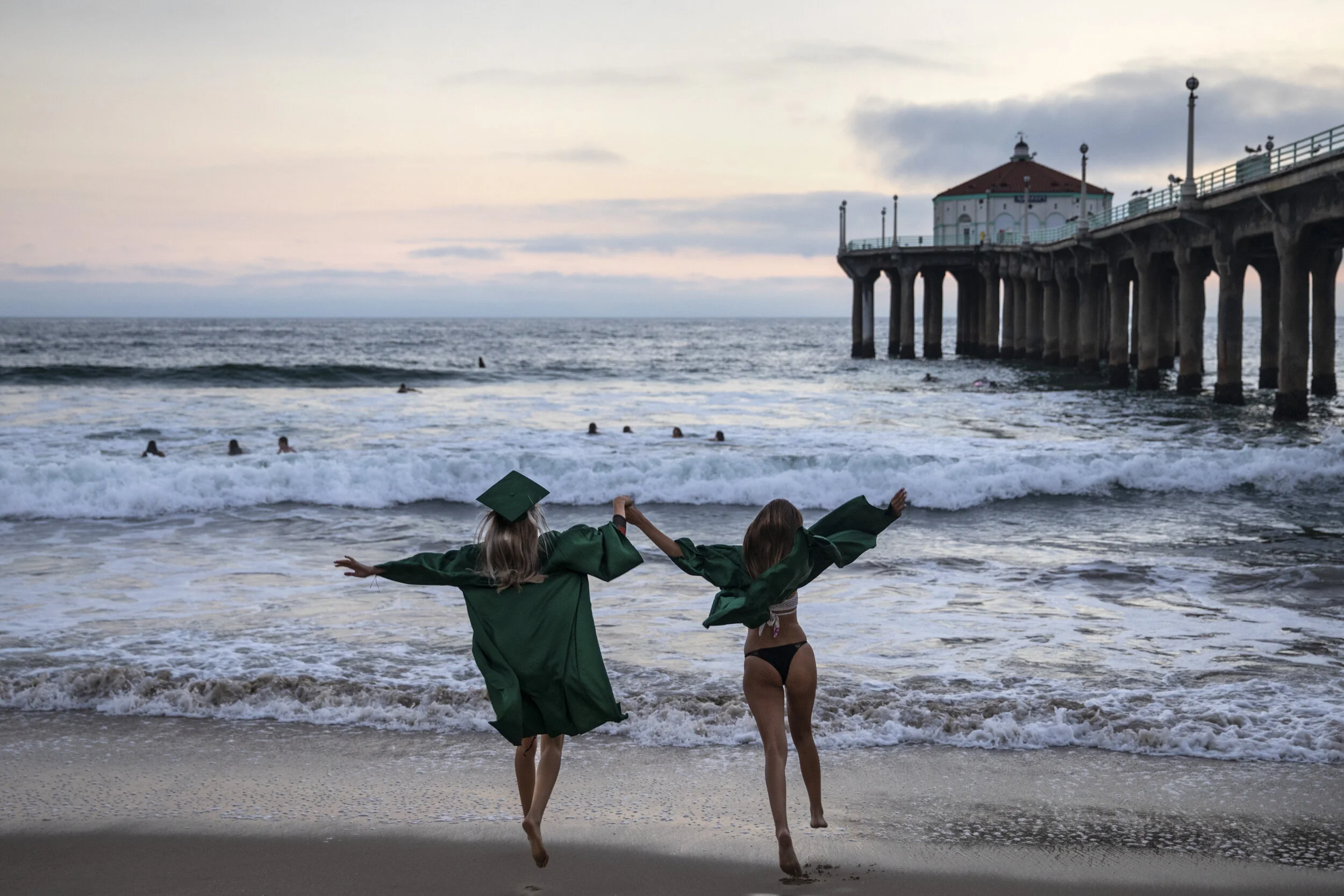 MANHATTAN BEACH, CA - JUNE 11: Sophia Strauss,17, left and Sarah Hoffmeister,17, right, celebrate following their drive-through graduation from Mira Costa High School in Manhattan Beach, CA, and a walk along the Strand path from Hermosa Beach Pier to the Manhattan Beach Pier, right, on Thursday, June 11, 2020. While Hoffmeister is headed to Westmont College in the fall, Strauss is undecided on her plans.