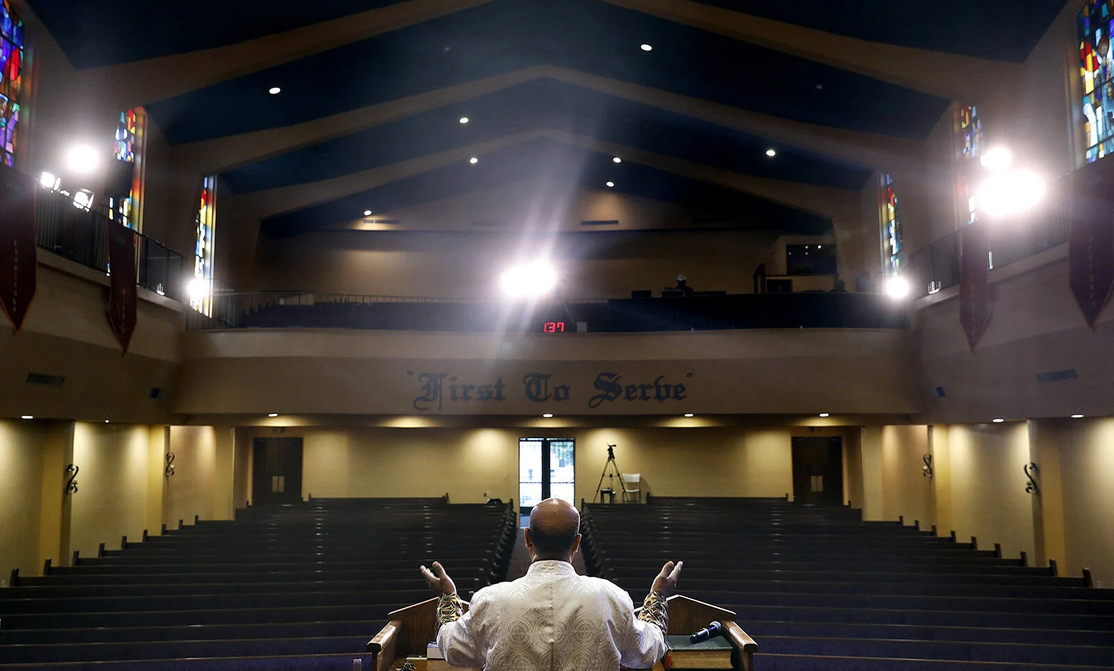 LOS ANGELES-CA-APRIL 9, 2020: Pastor J. Edgar Boyd films a "fireside chat" in an empty chapel at First A.M.E church in Los Angeles on Thursday, April 9, 2020. Pastor Boyd has urged his congregation to stay home during the coronavirus pandemic after recent reports that black people die of Covid-19 at a higher rate.