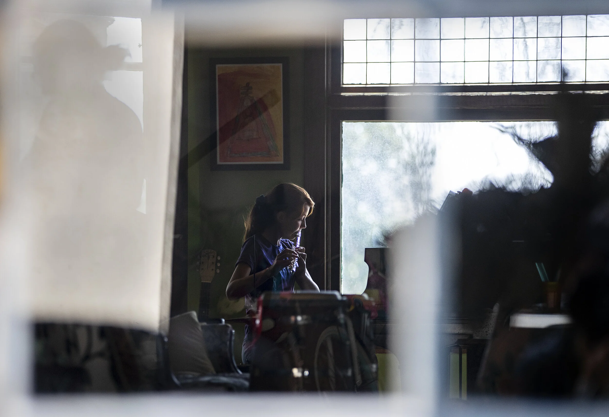 First Place: Music Lessons During Covid. A girl playing the flute during a music lesson at home. It’s just a beautiful photo. It’s not straighforward, with reflections and blurs surrounding her. She is focused, and has lovely rim-lighting outlining her face.