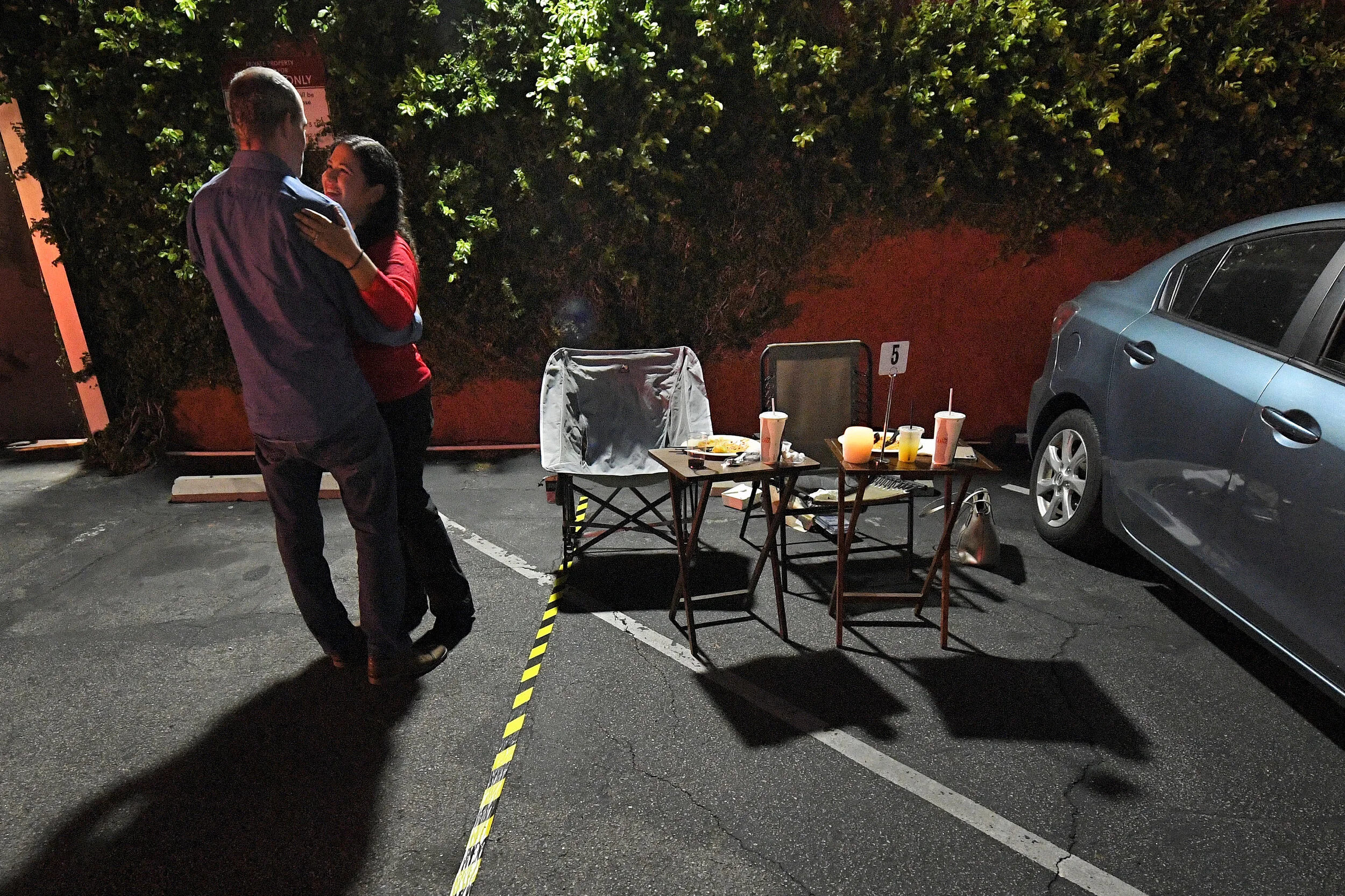Justin Buchman, left, and Becki Dennis Buchman dance as they dine in the parking lot of Vitellos Italian restaurant, Saturday, May 23, 2020, in Los Angeles. Customers at Vitellos are reserving parking spaces, bringing their own tables and even fine china to enjoy an al fresco takeout meal on the asphalt outside the Italian restaurant.