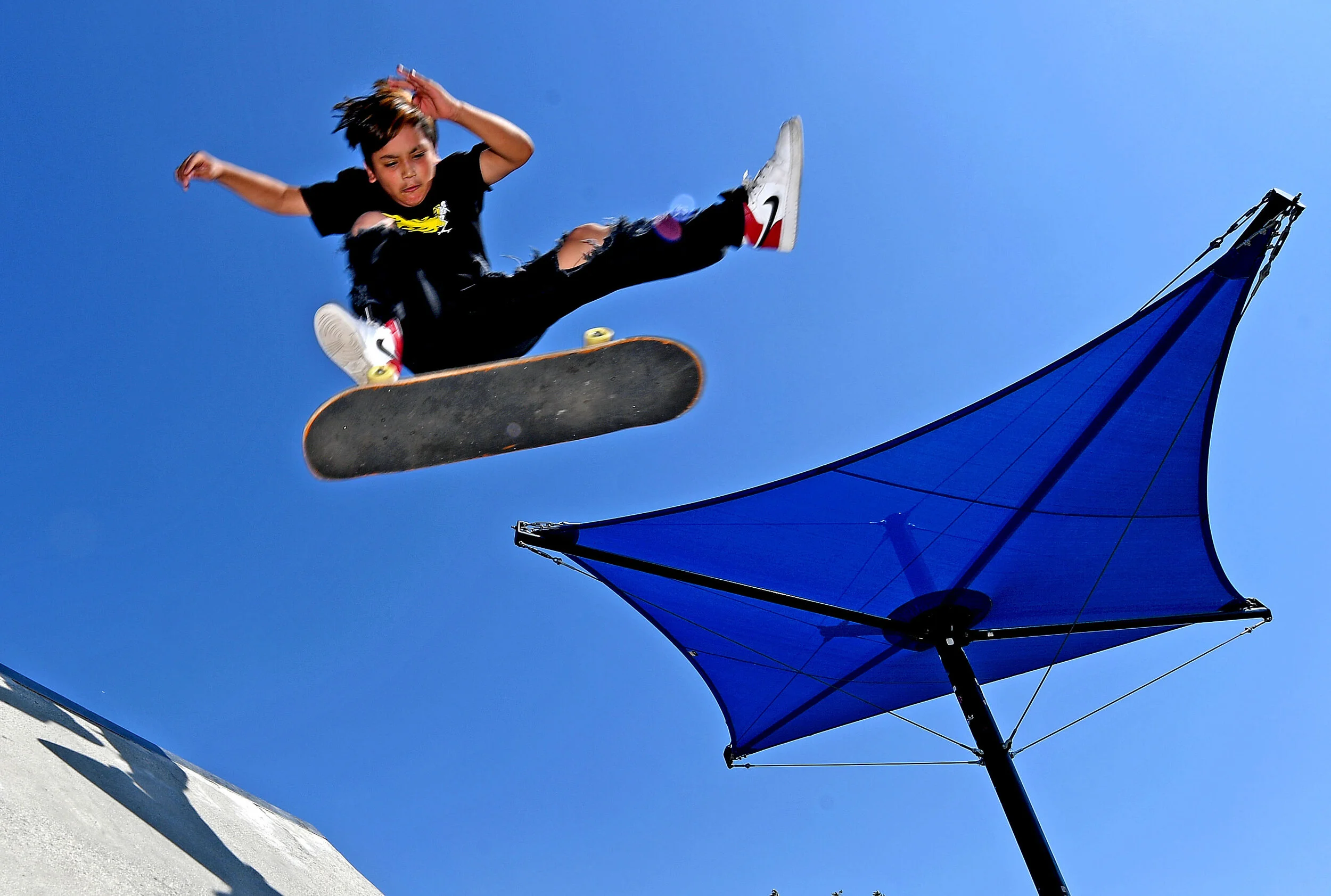 Above the rim during a game of horse for this basketball player as he goes up for a layup at Al Guhin Park in San Bernardino on Wednesday, June 24, 2020.