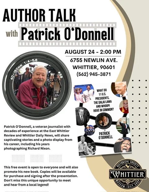 Patrick O'Donnell, a veteran journalist with decades of experience at the East Whittier Review and Whittier Daily News, will share captivating stories and a photo display from his career, including his years photographing Richard Nixon.